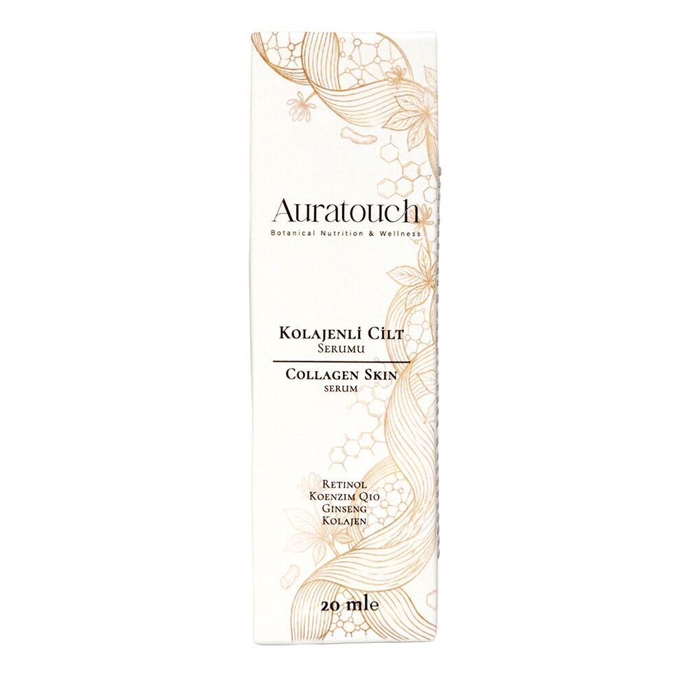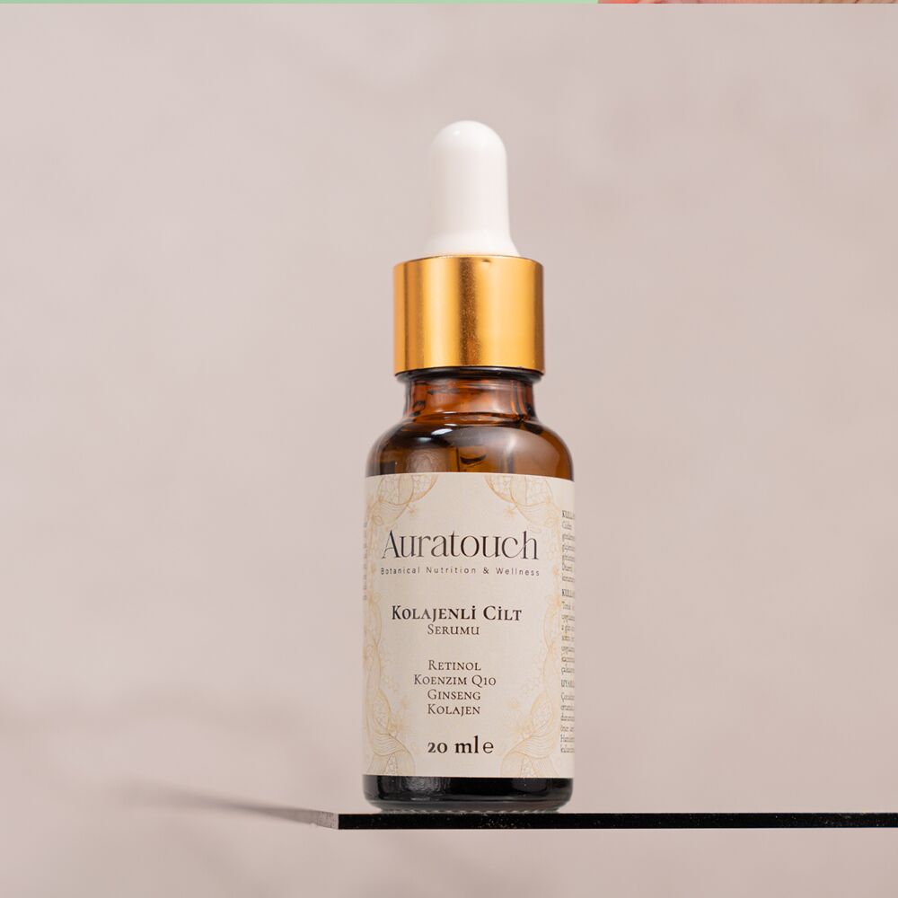 Auratouch Kolajenli Cilt Serumu, üzüm çekirdeği, hodan, jojoba, calendula ve aspir yağlarıyla zenginleştirilmiş yağ bazlı bir bakım serumudur. İçeriğindeki hidrolize kolajen, Koenzim Q10 (ubikinon) ve E vitamini (tokoferol) ile cilde yoğun bakım yapmaya, daha canlı ve pürüzsüz bir görünüm hissini desteklemeye yardımcı olur. Retinil palmitat (A vitamini türevi) içeren formülüyle özellikle akşam rutininde kullanıma uygundur.